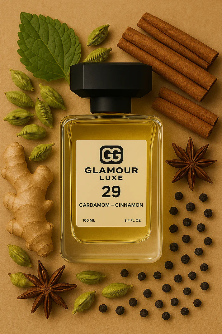 Glamour Luxe No. 29 is an intoxicating Eau de Parfum that exudes warmth, depth, and refined sensuality. Infused with the exotic richness of cardamom and the cozy sweetness of cinnamon, this fragrance creates a magnetic allure from the very first spray.